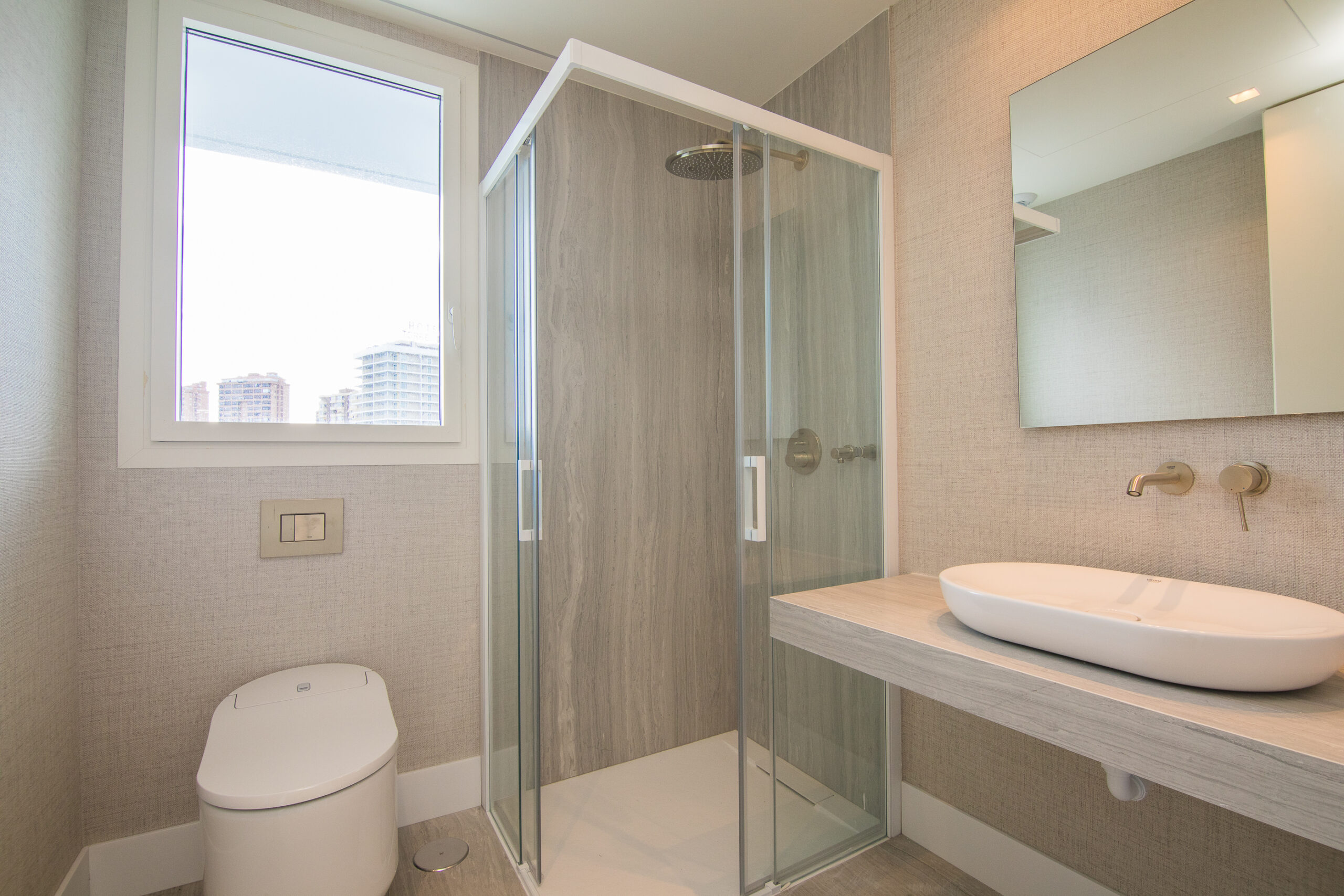 • Suelo porcelánico en WC y de la terraza de piedra natural con acabado antideslizante.