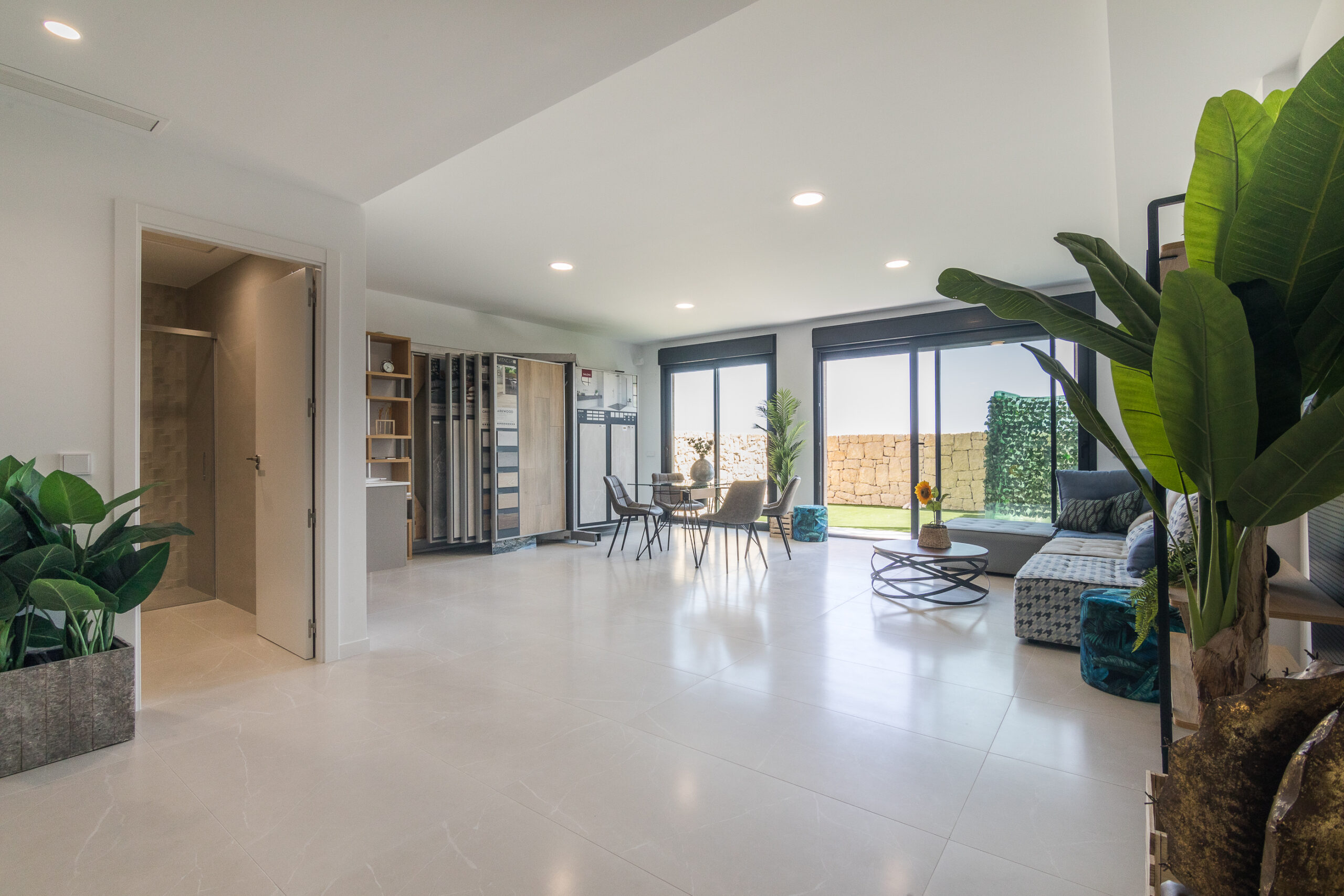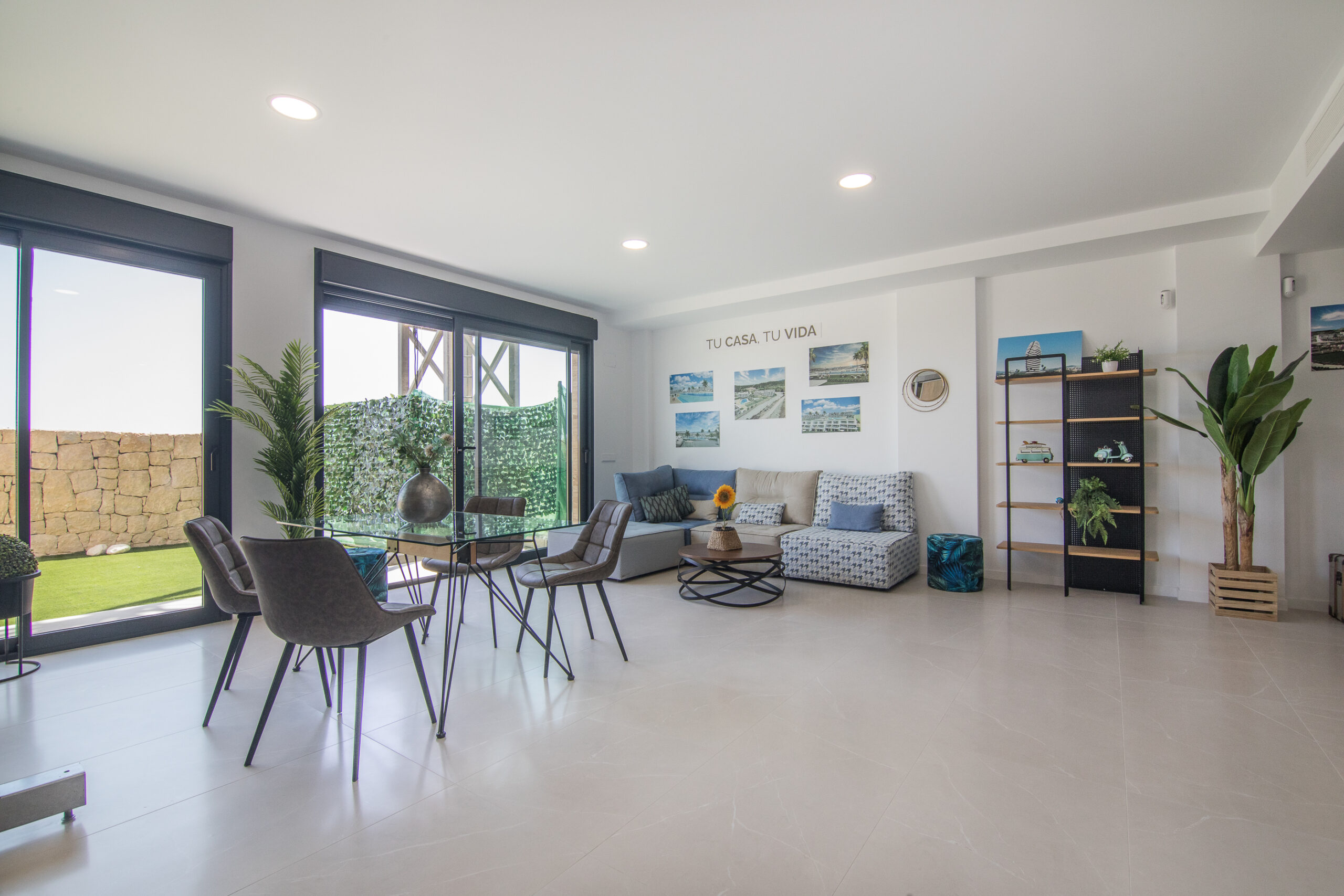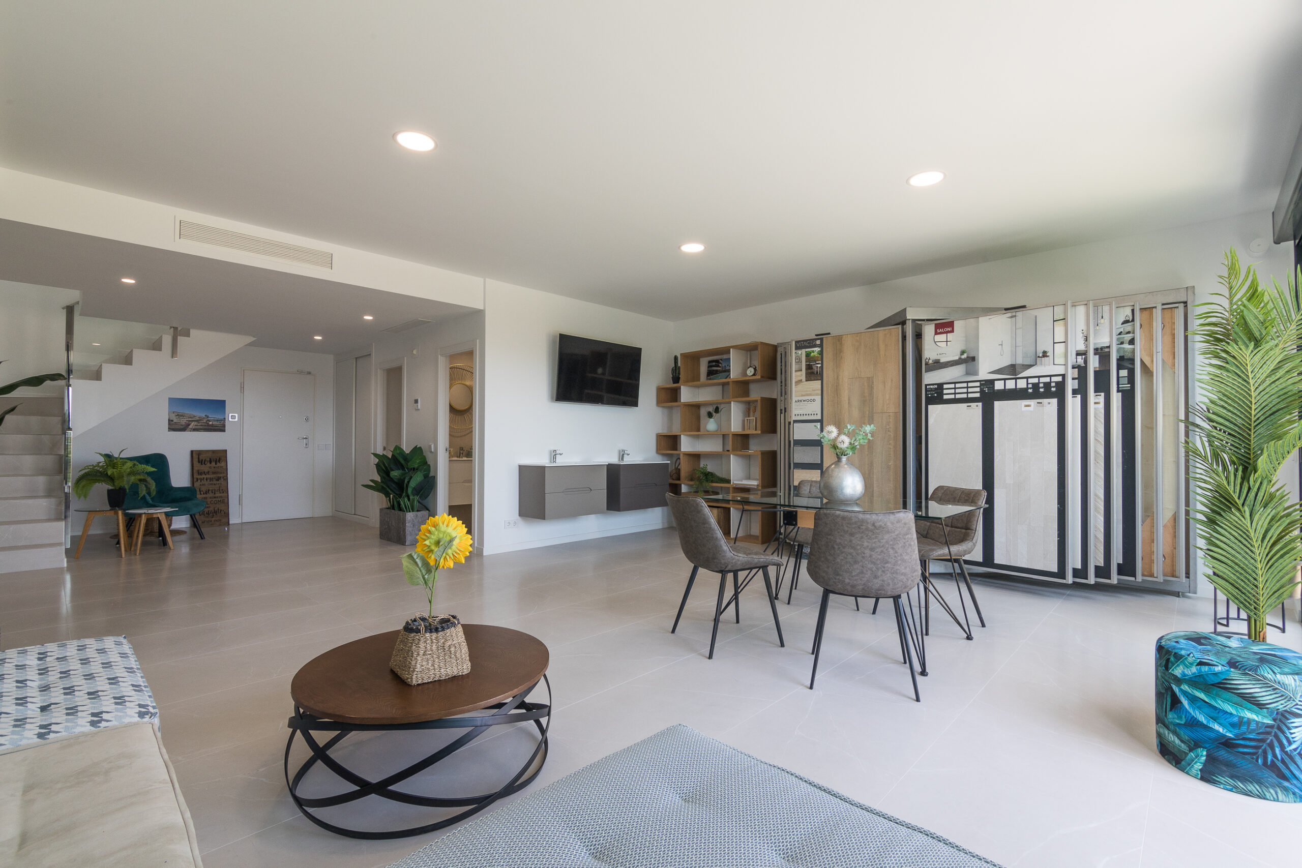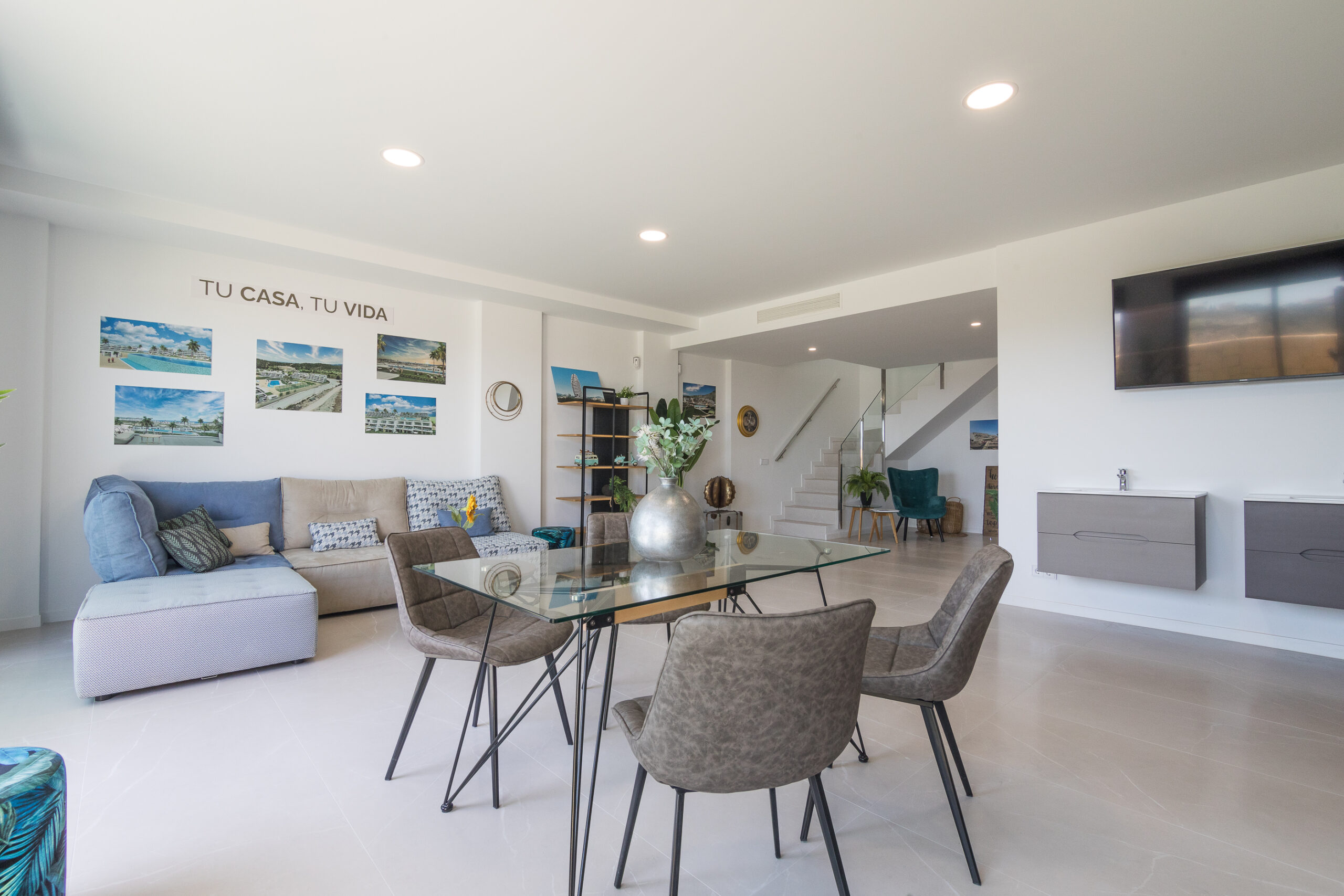 En la planta principal, la vivienda dispone de un amplio salón-comedor con cocina office integrada, moderna y totalmente equipada con electrodomésticos de alta gama. Desde esta estancia se accede a una espectacular terraza de aproximadamente 30 m², ideal para disfrutar del clima mediterráneo durante todo el año.