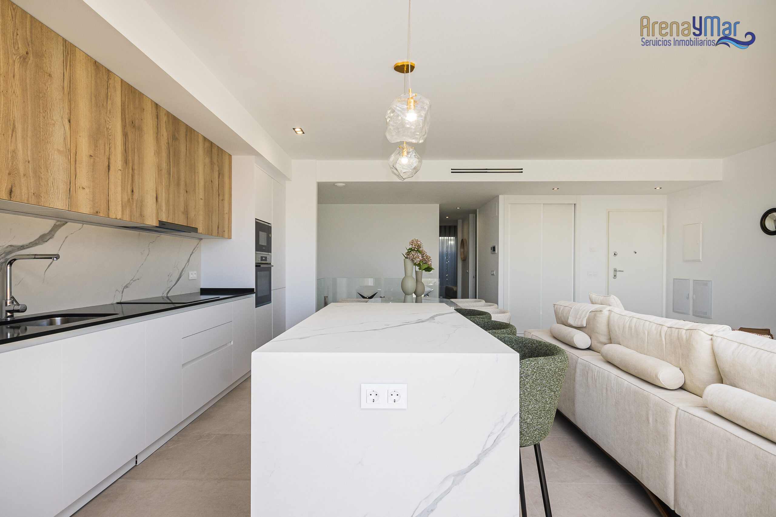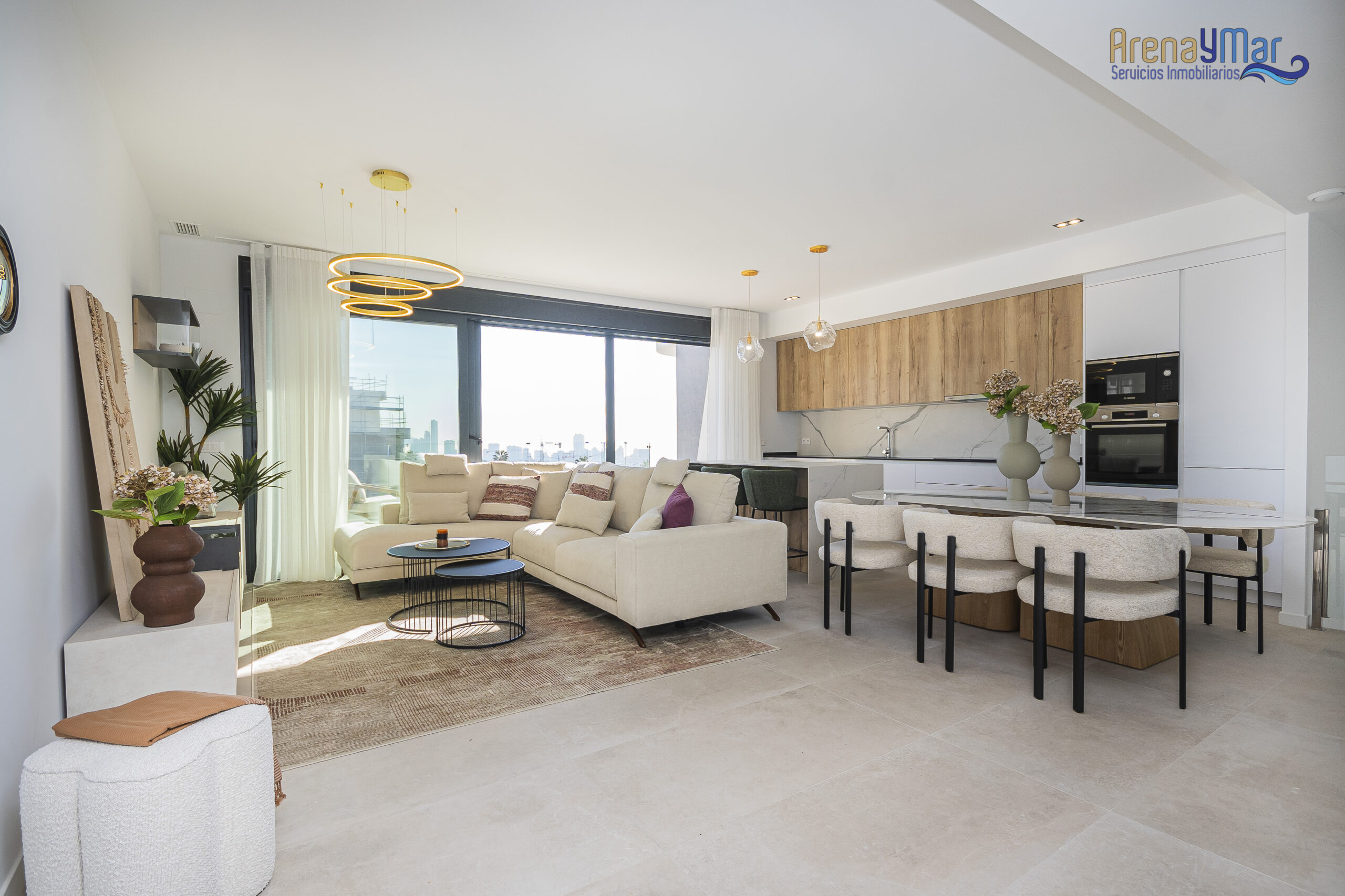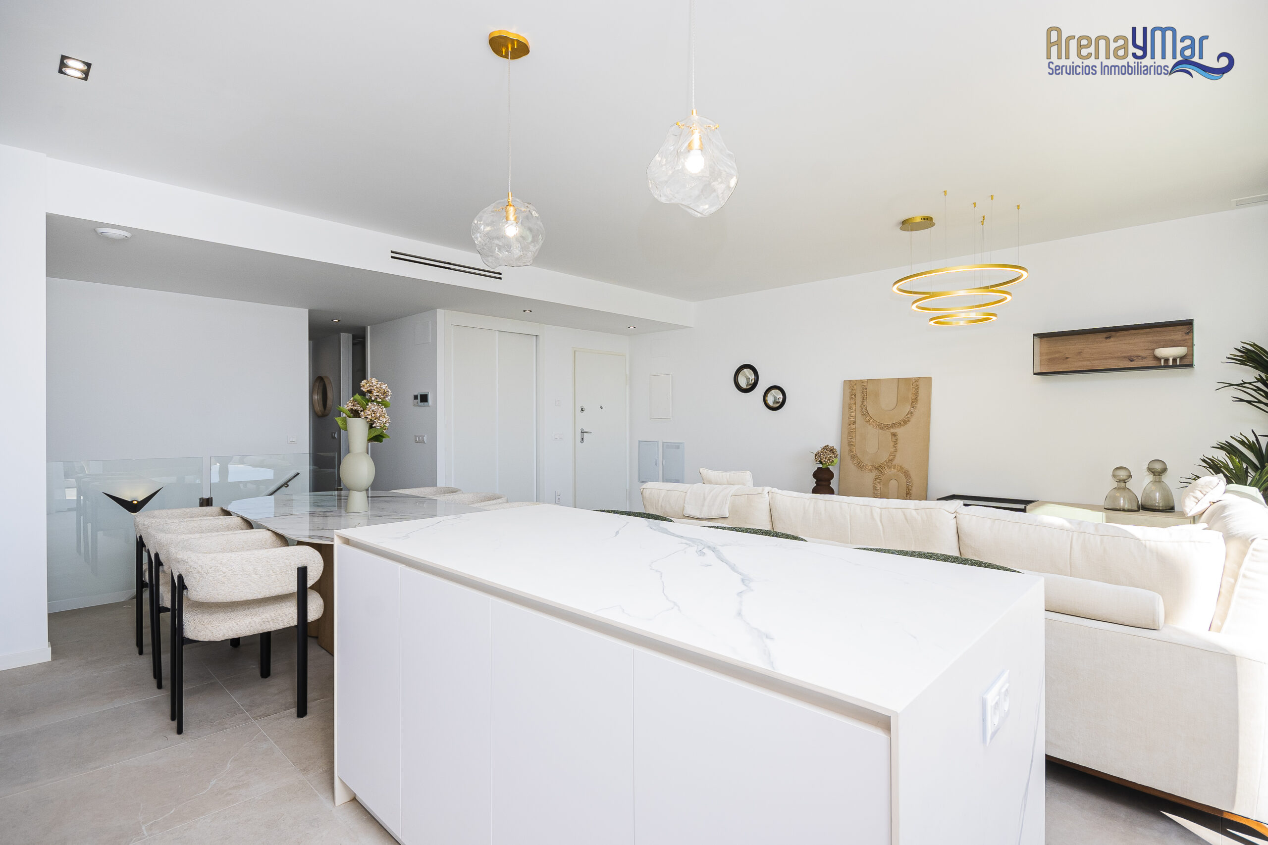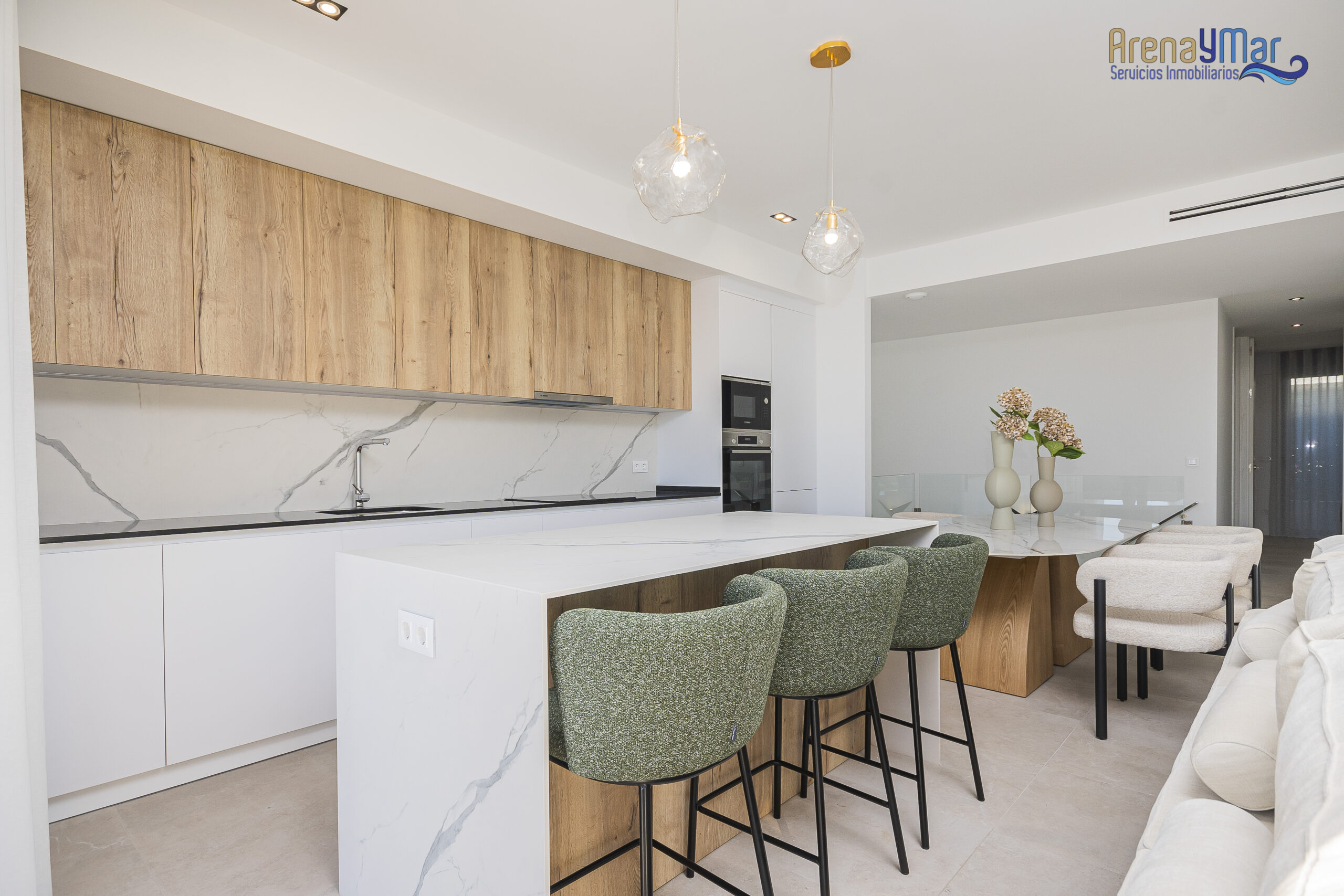 En la planta principal, la vivienda dispone de un amplio salón-comedor con cocina office integrada, moderna y totalmente equipada con electrodomésticos de alta gama. Desde esta estancia se accede a una espectacular terraza de aproximadamente 30 m², ideal para disfrutar del clima mediterráneo durante todo el año.