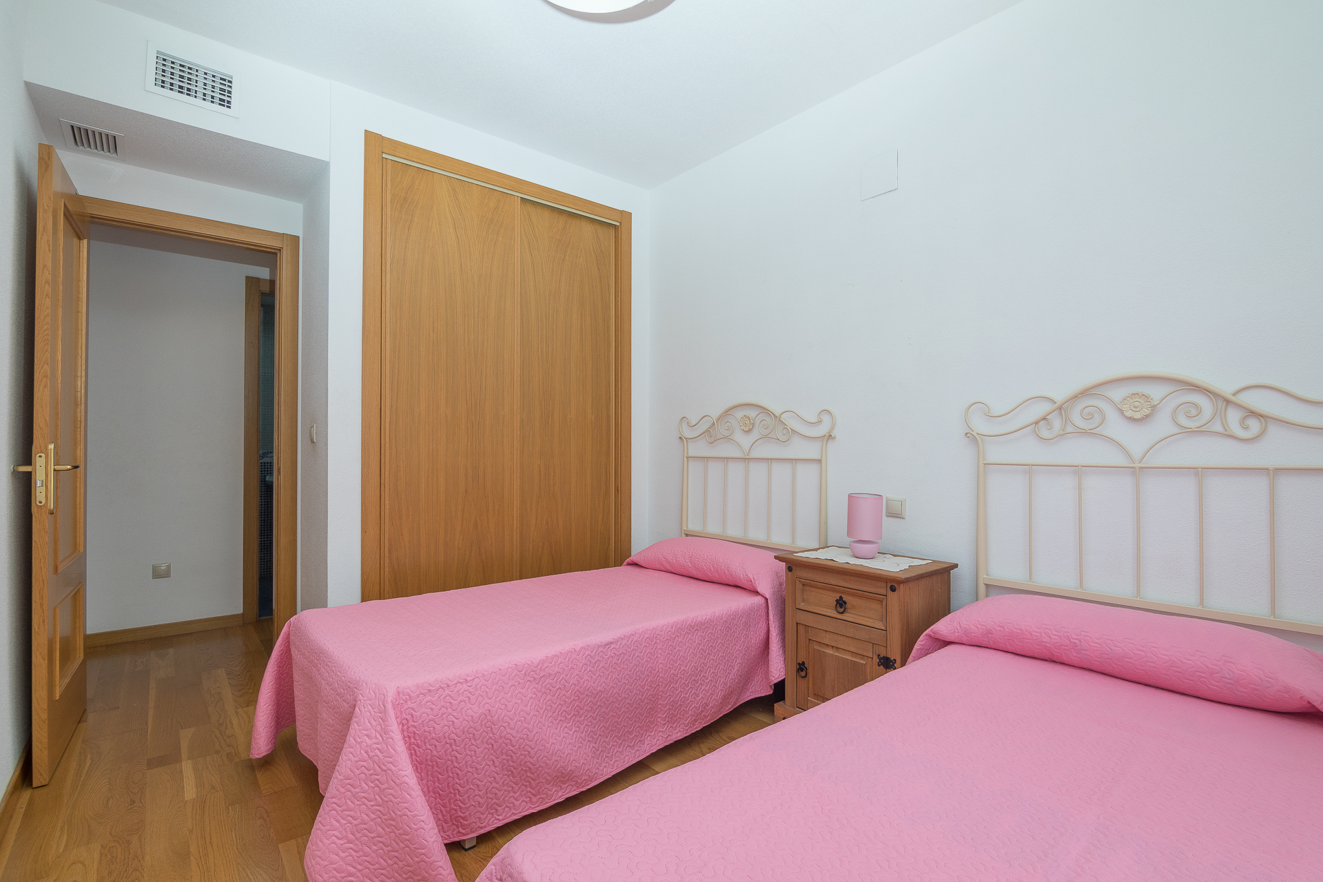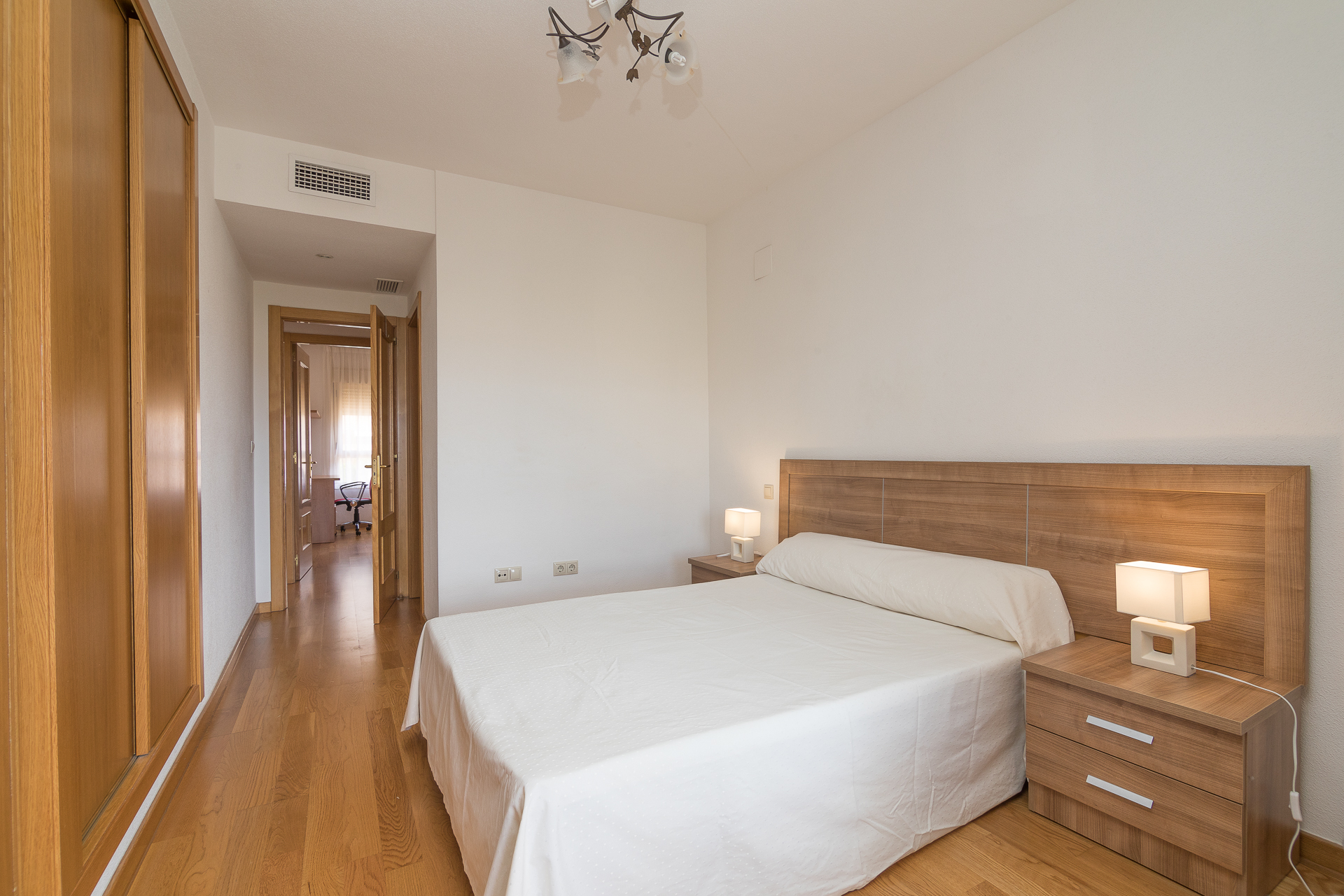 El piso dispone de tres amplios dormitorios, destacando la suite principal, que cuenta con baño privado con bañera y acceso directo a la terraza, creando un espacio íntimo y confortable. Los otros dos dormitorios ofrecen múltiples posibilidades, ideales tanto para uso familiar como para despacho o habitación de invitados. La vivienda se completa con un segundo baño con plato de ducha, de diseño práctico y funcional.