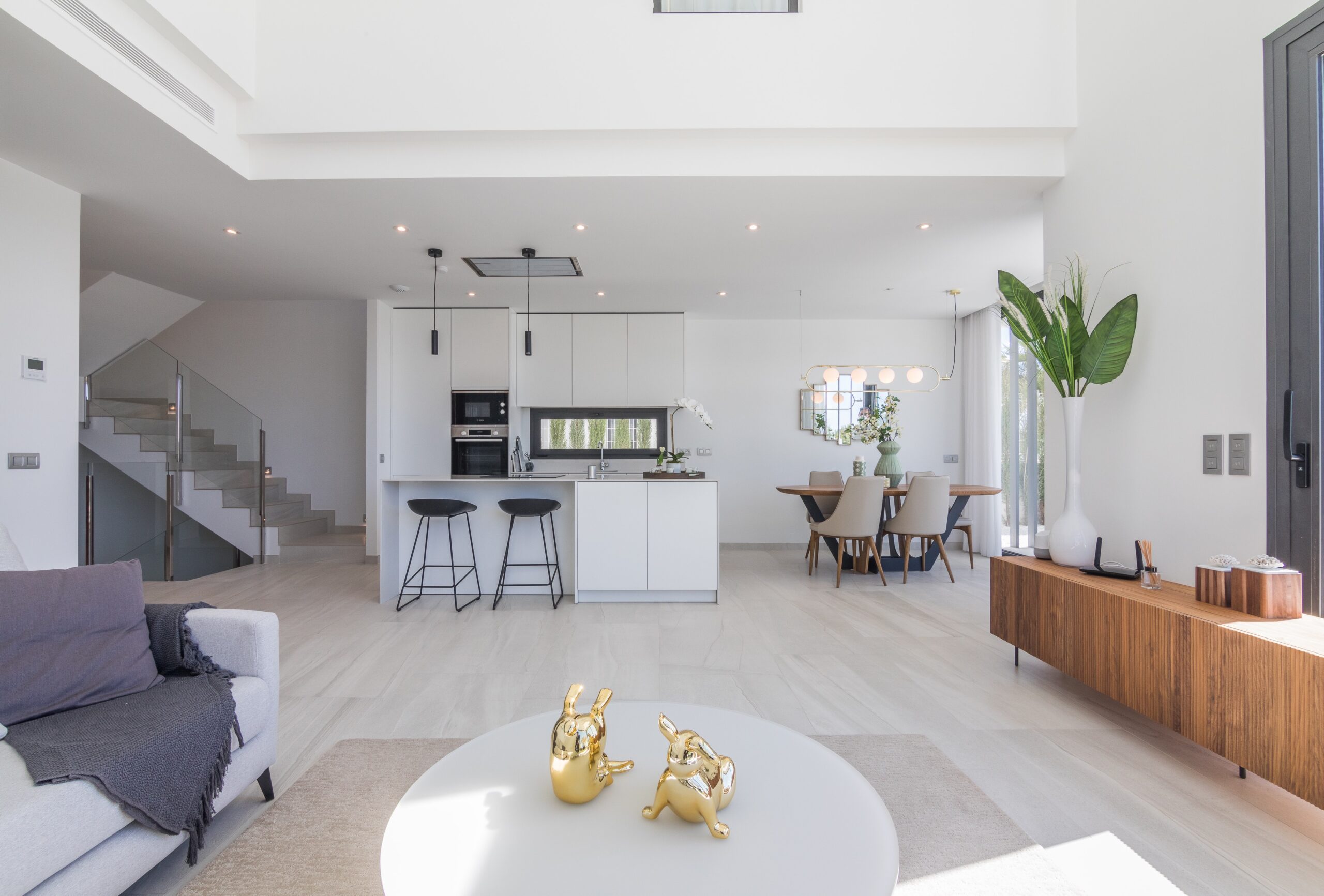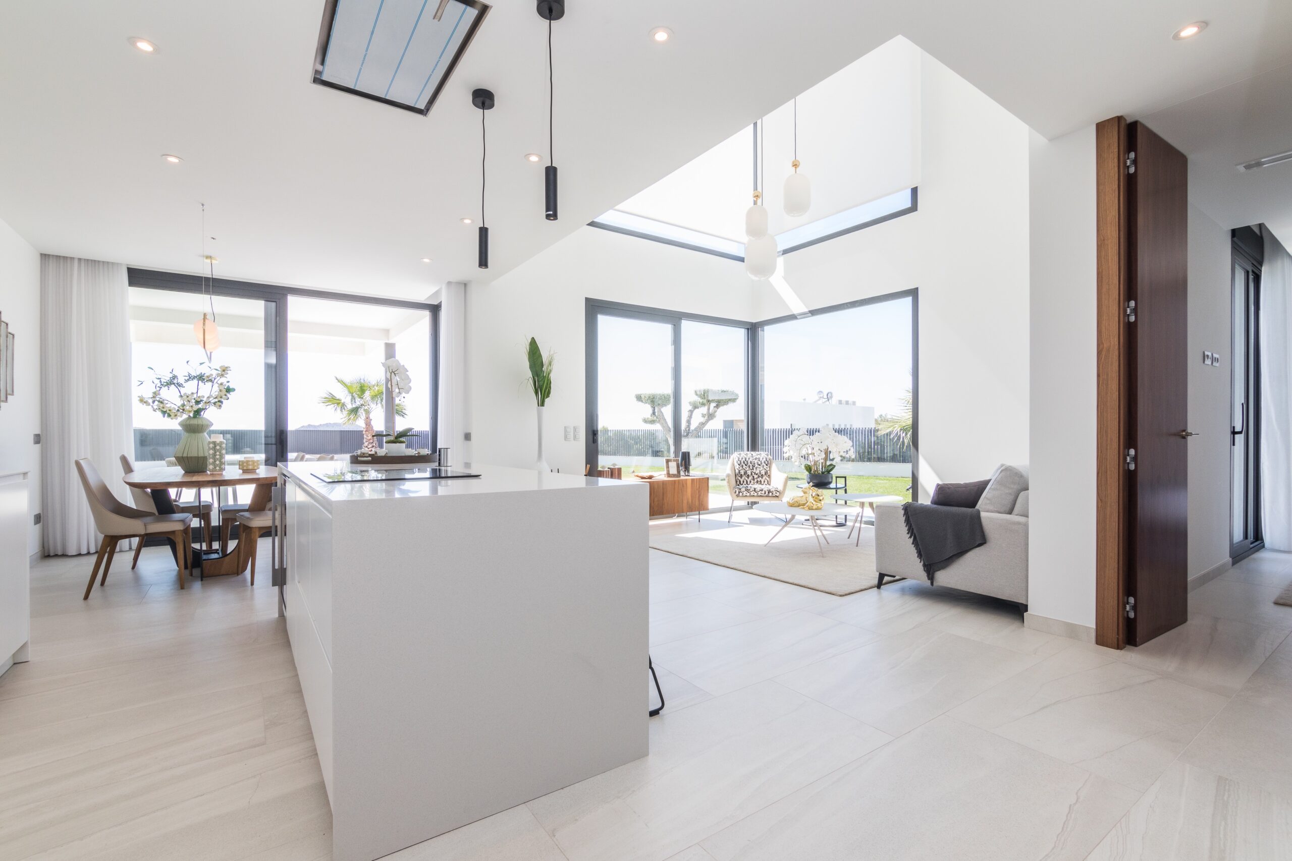 El corazón de la vivienda lo ocupa un impresionante espacio diáfano de salón–comedor–cocina de más de 54 m², inundado de luz natural gracias a sus grandes ventanales de suelo a techo. La conexión directa con las terrazas, el jardín y la piscina permite una continuidad perfecta entre interior y exterior, ideal para recibir invitados o disfrutar en familia.