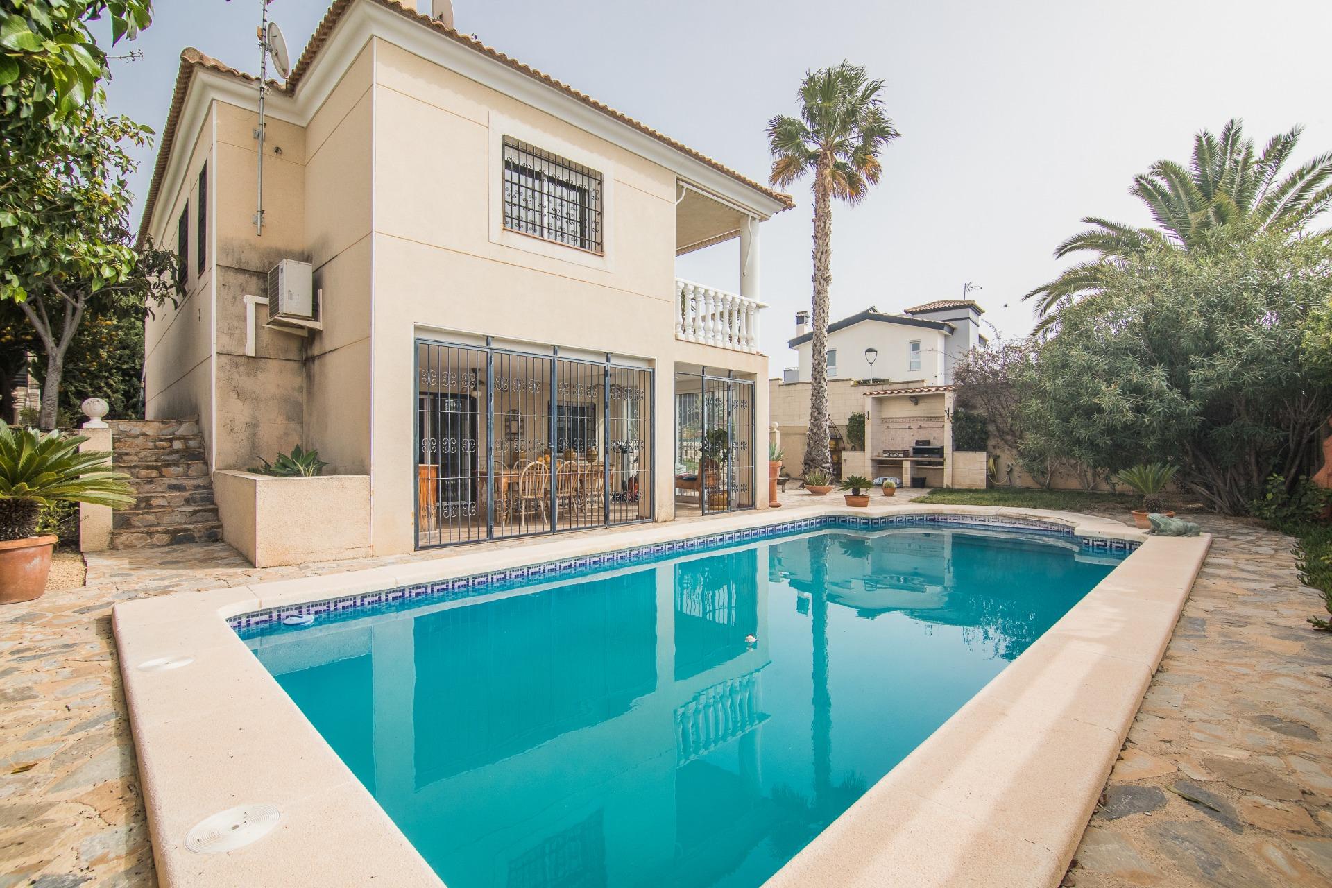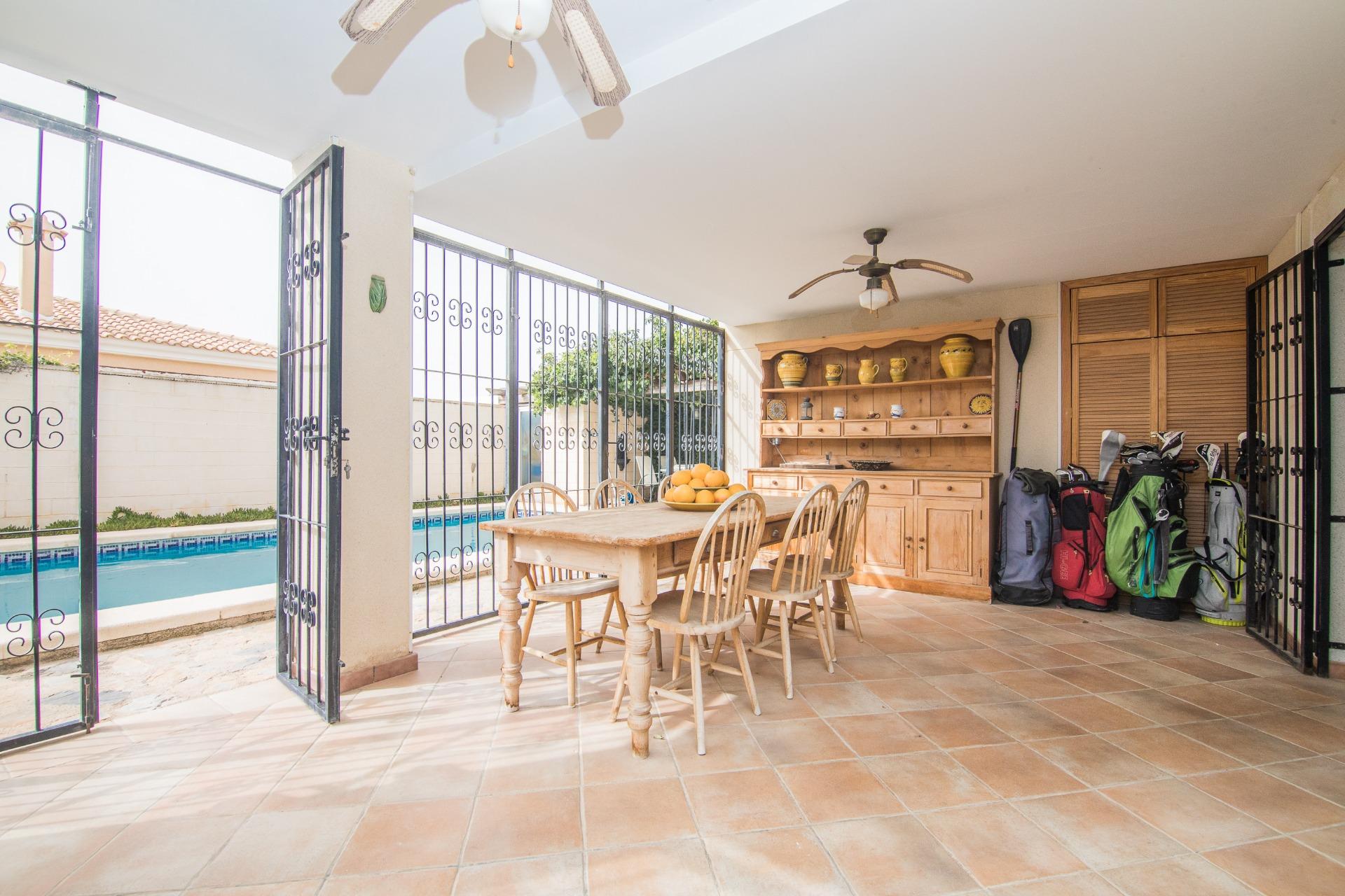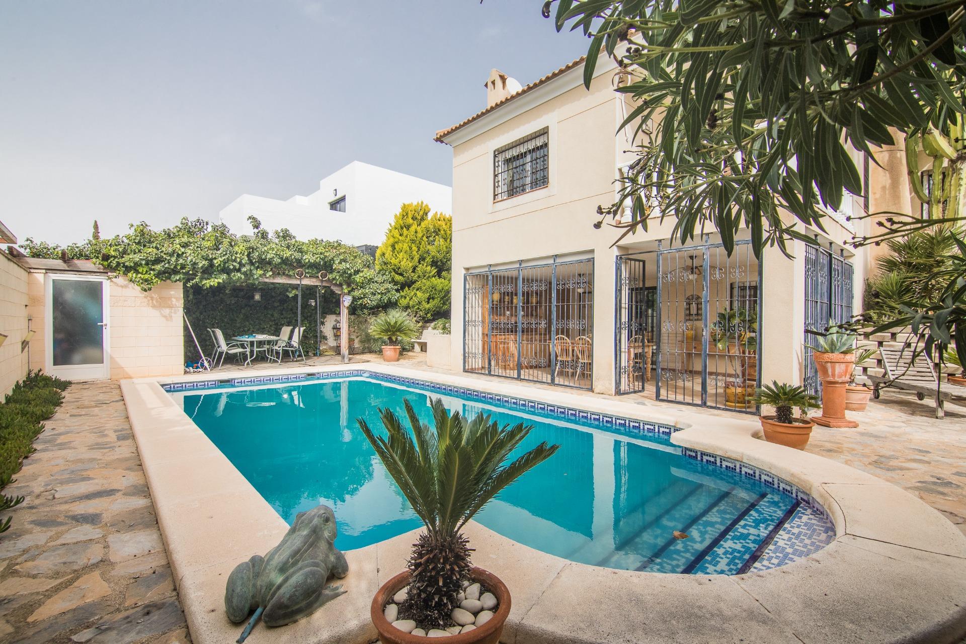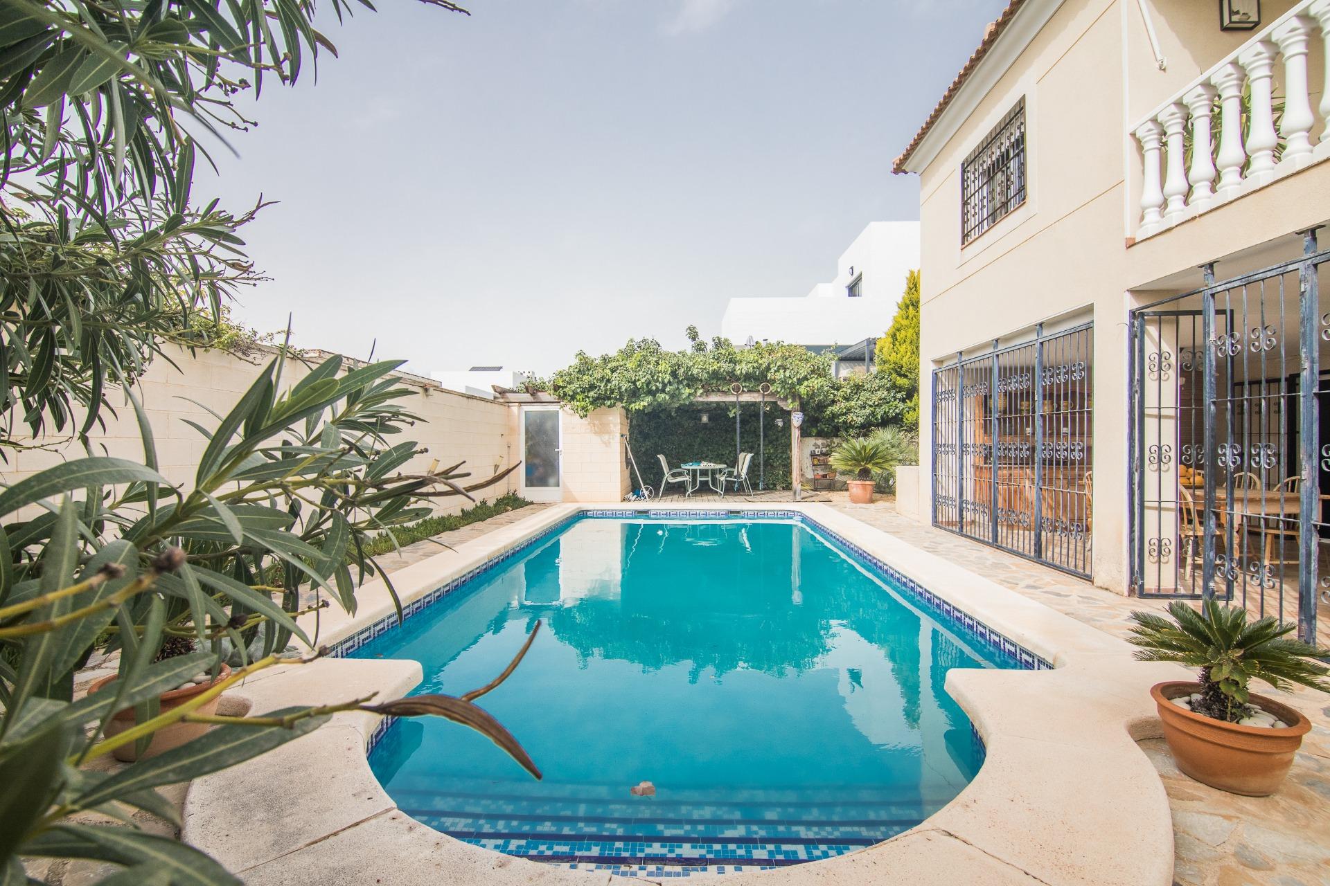 El exterior es, sin duda, uno de los grandes atractivos de la propiedad. La parcela alberga una magnífica piscina privada, rodeada de zonas ajardinadas con palmeras y vegetación mediterránea, creando un auténtico oasis de tranquilidad.
