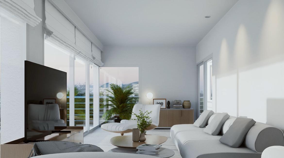 The living area consists of a generously sized main living room, where light floods in through panoramic windows that connect directly with the exterior, creating a continuous sense of freedom and harmony. The separate kitchen, fully equipped with high-end appliances, combines cutting-edge design with impeccable functionality, ideal for both everyday use and special occasions.